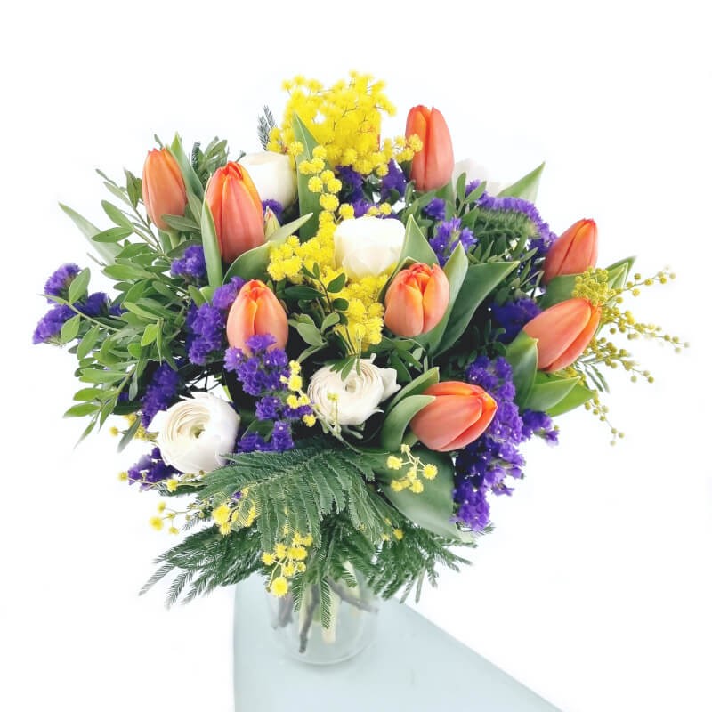 Composé de Mimosa, de statice, de renoncules, de tulipes et de feuillage