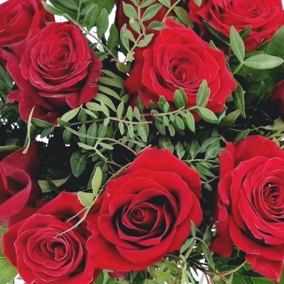 Composé de grandes roses rouges GROS BOUTONS et de feuillage