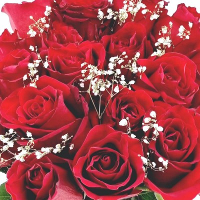 Composé de grandes roses rouges GROS BOUTONS et de gypsophile